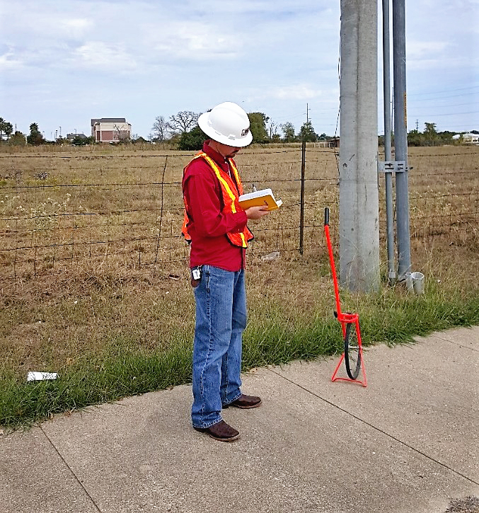 Field Service Technician collecting valuable data with a wheel, compass, and field book for reference.